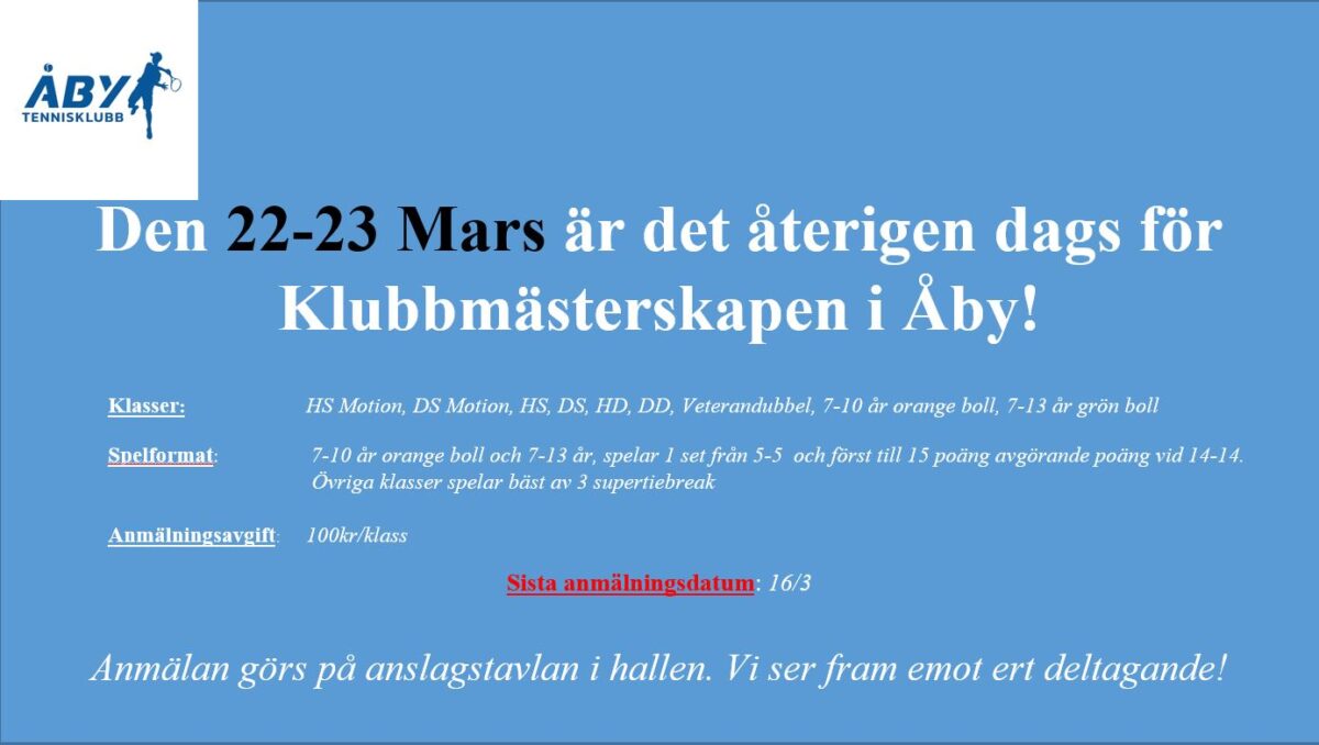 Missa inte att anmäla er till klubbmästerskapen som går av stapeln med start den 22/3. Spel den 23/3 är beroende av antalet anmälda.